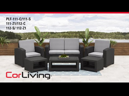 Relax in style this summer with this unique 6 piece patio set. Includes 2 chairs, 2 ottomans and a coffee table crafted entirely from durable, weather-resistant all weather pressed-resin wicker. Engineered to give you a natural-looking wicker rattan design that will complement any patio or garden, this set is virtually maintenance free, rust proof, and decay proof. Assemble your new patio set in minutes allowing you even more time to enjoy your outdoor space. This convenient set is truly built to last.Product Specifications