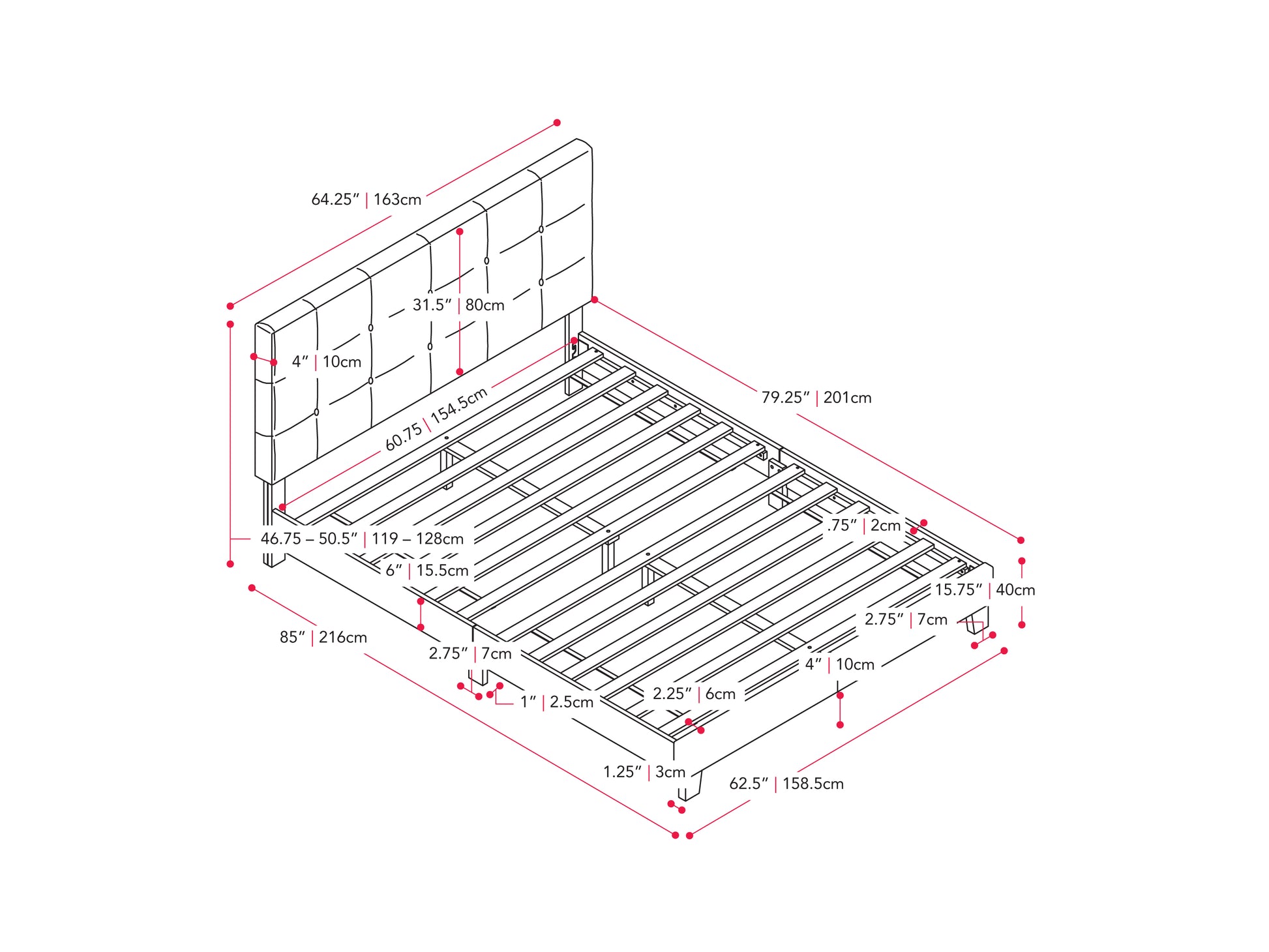Experience the perfect blend of form and function, engineered for comfort and convenience. The generously padded headboard invites you to lean back and relax, whether reading your favorite novel or enjoying a peaceful morning in bed. Built with a robust slat support system and center leg stability, this bed eliminates the need for a box spring while providing unwavering support for virtually any mattress height you choose.