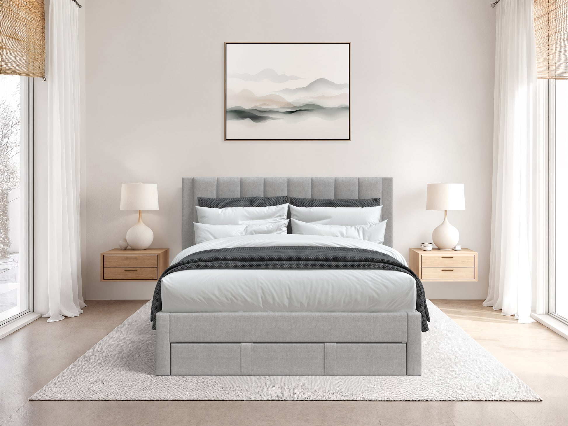 Immerse yourself in the details that set this bed apart – from the sophisticated fabric‐wrapped legs to the thoughtfully designed panel details on the storage drawer. The built‐in slat system with center legs eliminates the need for a box spring, creating a clean, contemporary profile while saving time and money. This bed is a foundation for your perfect bedroom retreat, available in light grey or warm beige.