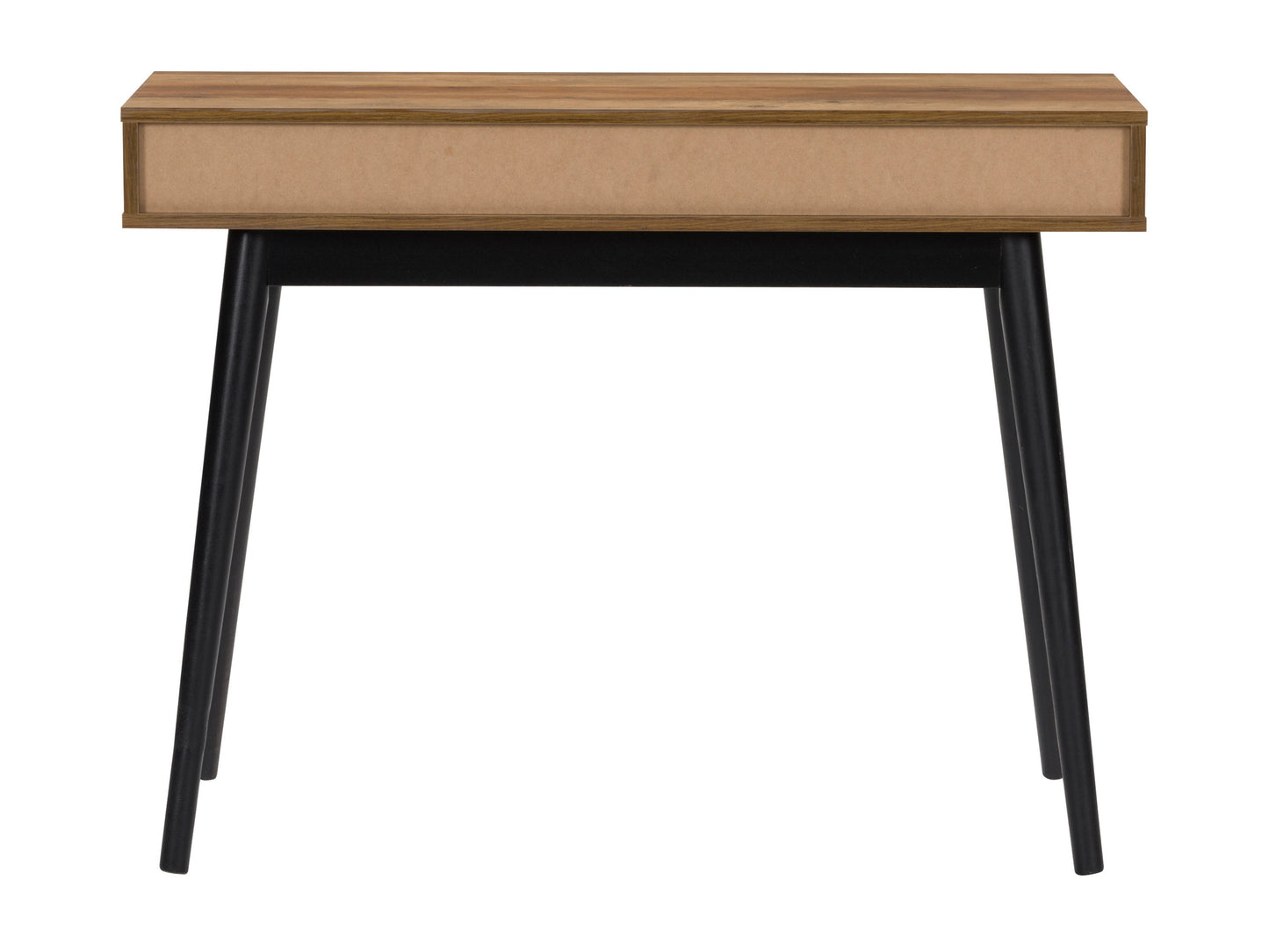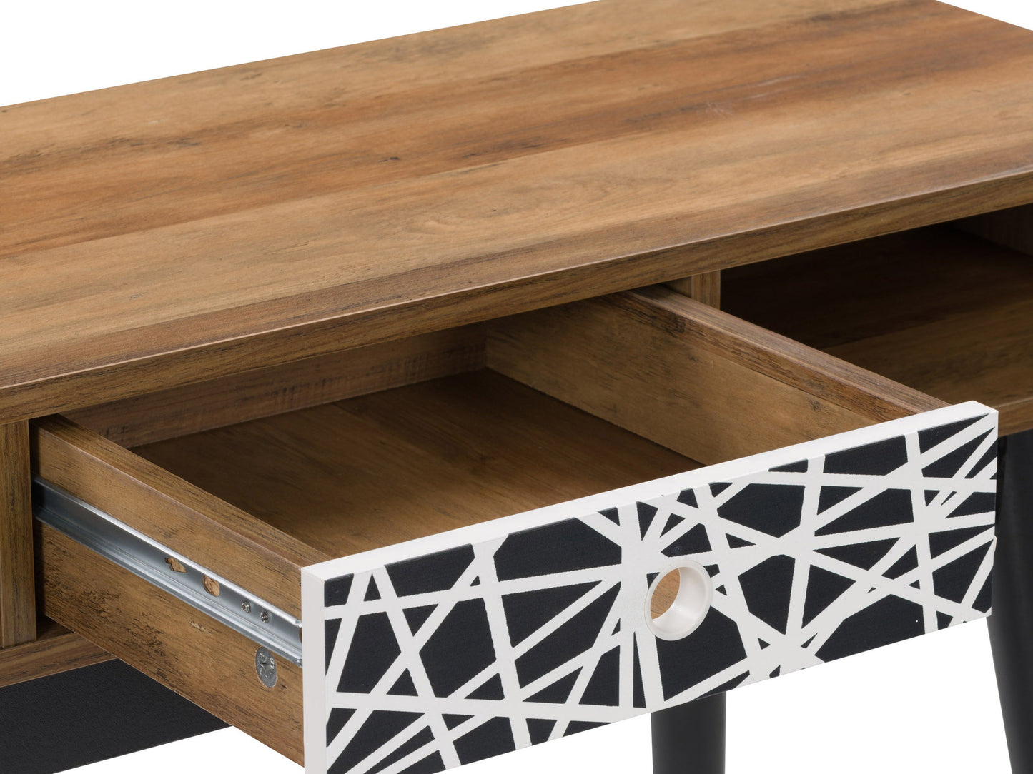 A mid‐century design with a stylish pattern. This easy to care for table can be used for a desk or entryway table. Featuring a stylish, eye‐catching chevron‐patterned drawer that keeps your supplies and accessories out of sight framed with peek‐a‐boo shelves on each side for storage and organization. The splayed legs are complemented with a wood‐grain laminate desktop that will be sure to be the highlight in any entryway or workspace.Product Specifications