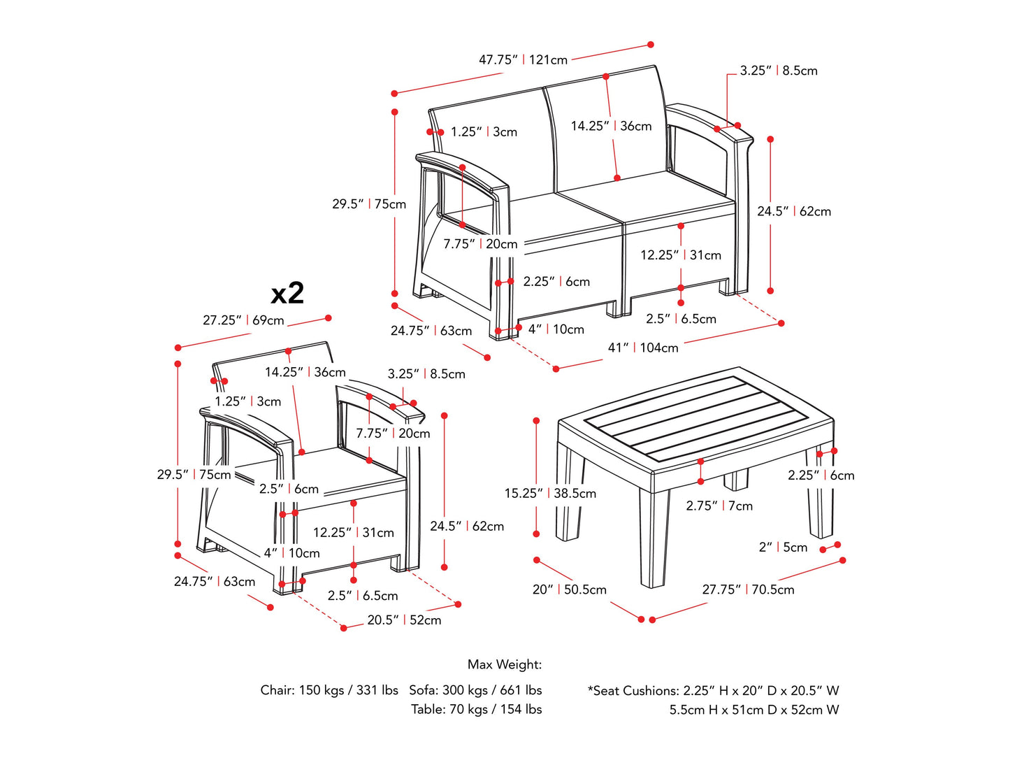 Whether catching some sun and listening to a favorite podcast or casually catching up with close friends over coffee on the patio, this four‐piece sofa set is a must‐have for your summer plans. Crafted from a woven wicker rattan that’s designed to stand up to harsh sunshine and summer rainstorms. Plus, the sofa and two chairs include foam‐filled cushions for added comfort, while the coffee table provides the perfect place to rest your drinks and snacks.Product Specifications