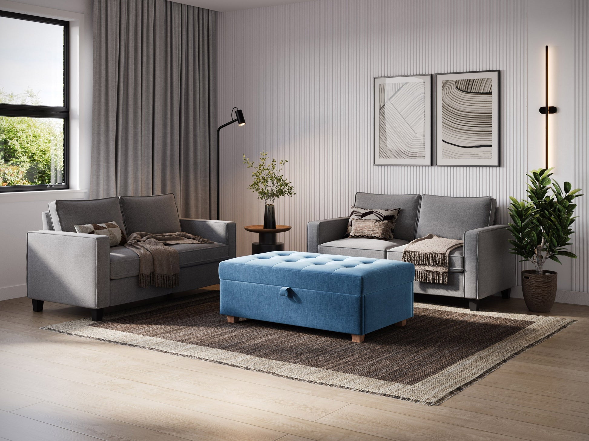 - A large storage ottoman with a modern style, designed to fit any décor.