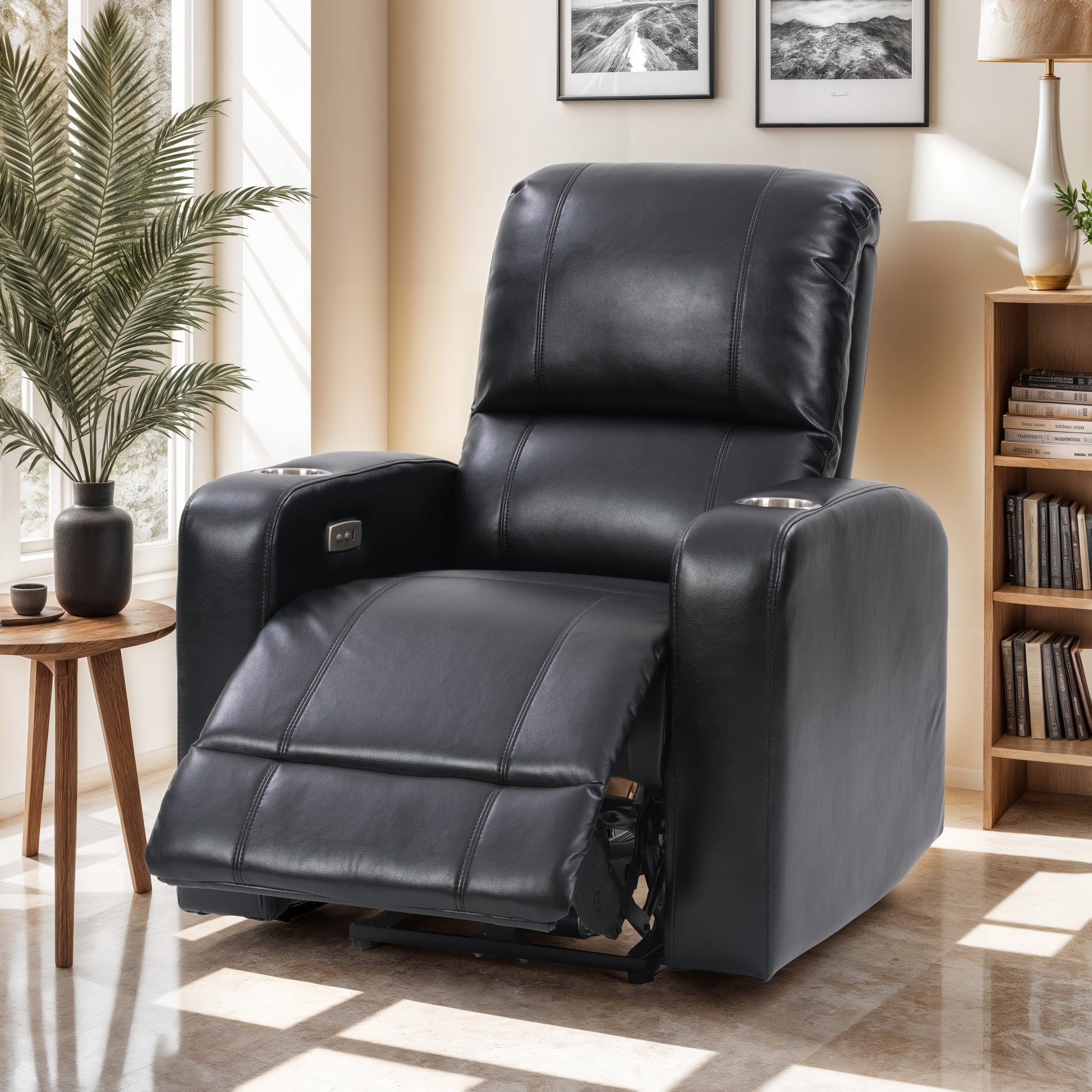 Do movie nights right in your brand new Oren PU Theater Recliner. Wrapped in sleek, durable PU fabric with framed topstitching for a luxury vibe. With the click of a button, you can recline to your desired position and adjust at any time. Equipped with a USB charger, you don't need to leave the comfort of your chair to plug in personal electronics. Generous padding and a metal‐framed cup holder make your movie nights much more comfortable than any theatre. Just grab your popcorn and a blanket and enjoy!Product Specifications
