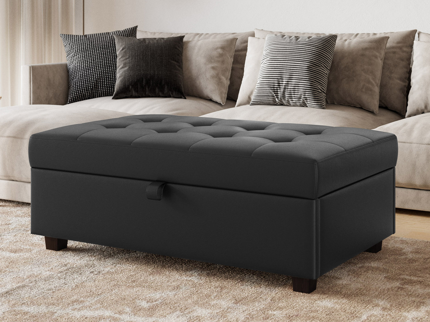 Dive into the everyday luxury of our vegan leather storage ottoman, where comfort meets contemporary design in the heart of your living space. A large ottoman serves as both an accent and centerpiece. It gives you a place where stories come to life, from quiet mornings with a book to lively evenings with friends. Available in black or brown vegan leather, its quiet luxury will speak to your sense of modern style. And with its clever hidden storage, you'll find your space stays effortlessly tidy, allowing for more of those unplanned, precious moments that life is all about.