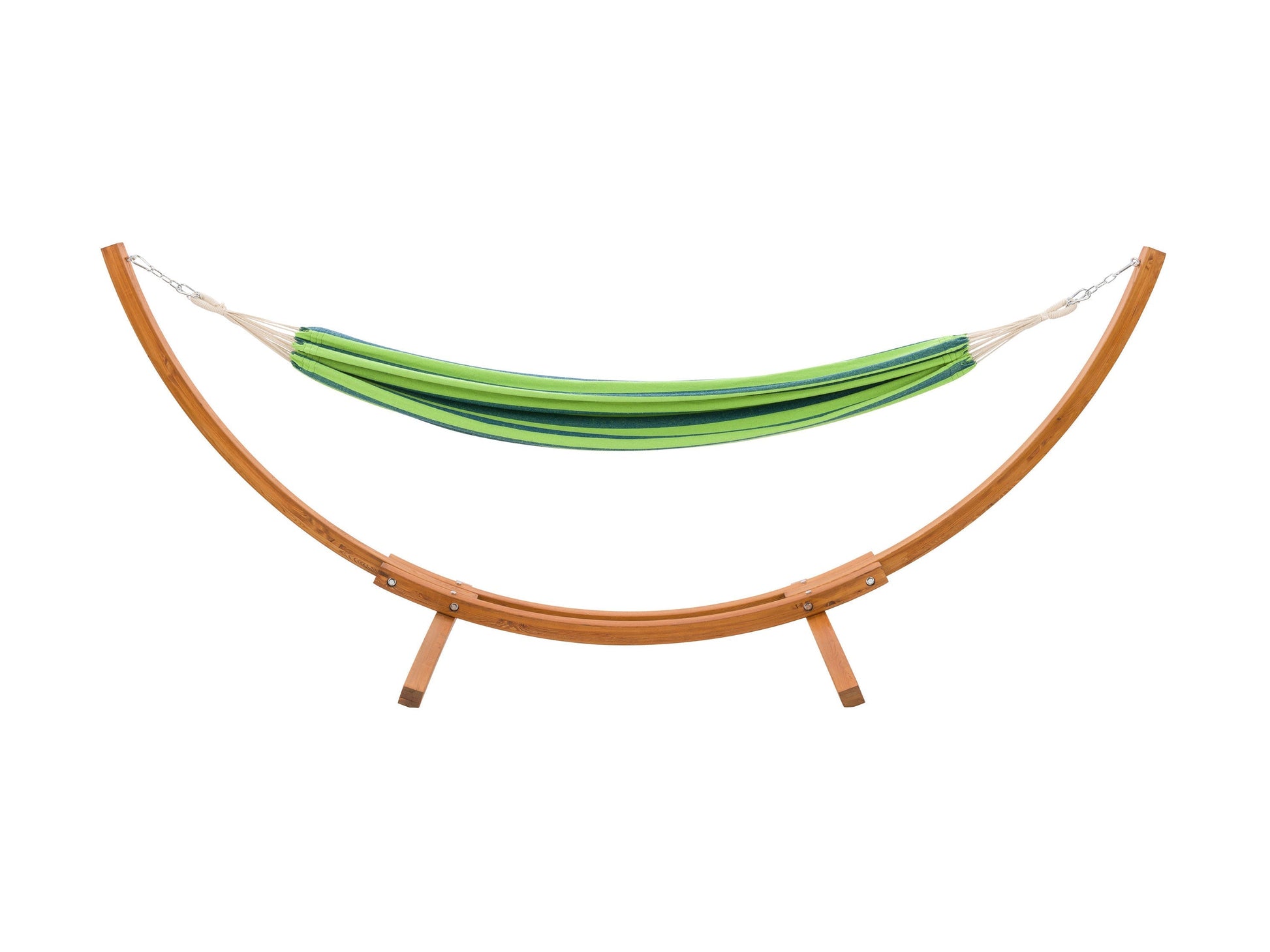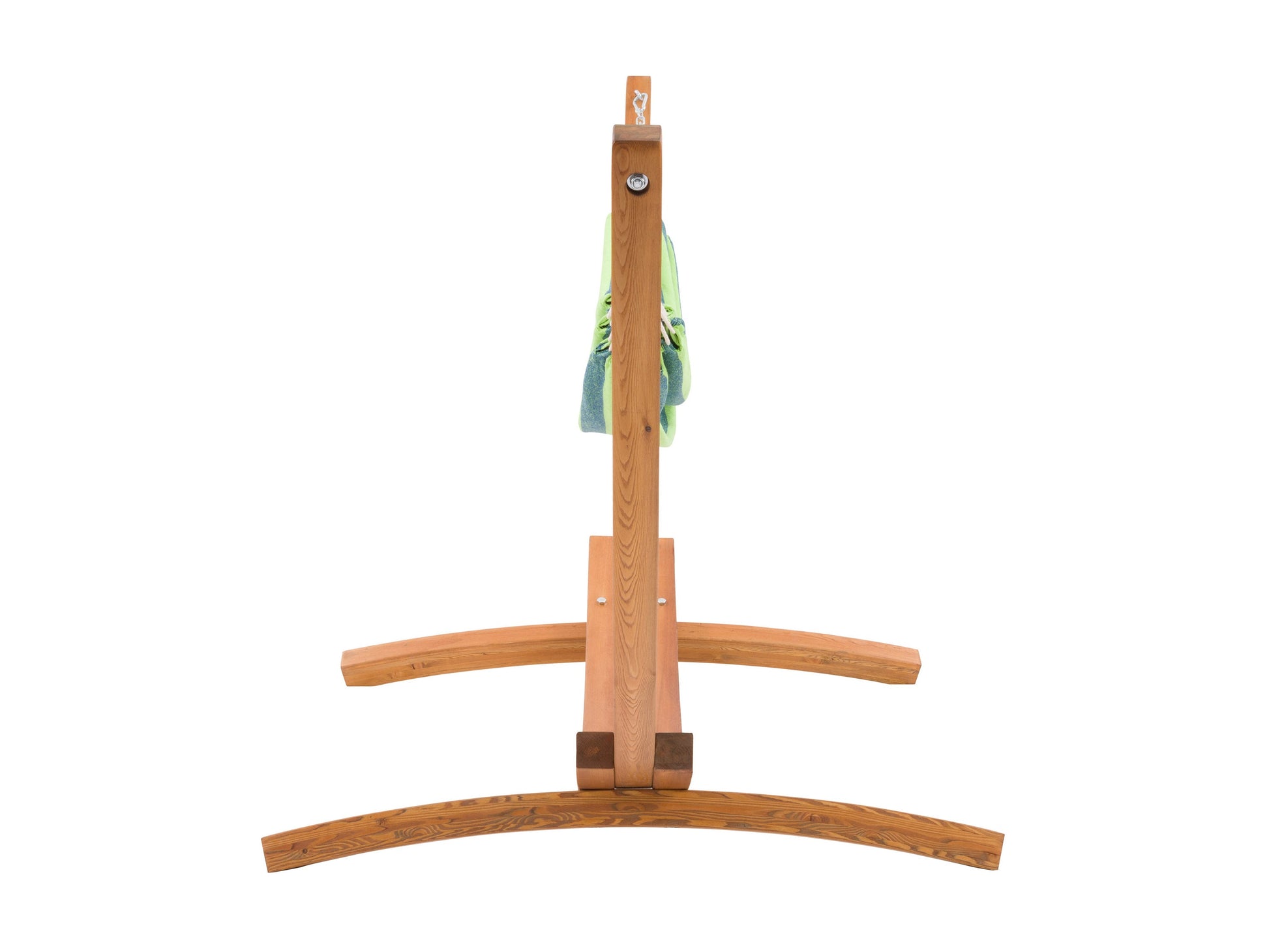 Eye‐catching curved solid wood frame sets this Free Standing Sling Hammock apart from the crowd. The larch wood curved stand provides durability and stability and the densely woven cotton hammock is easy to remove for storage. The free‐standing design means there is no need for any other support, it’s simple, just place it in your favorite backyard spot and relax!Product Specifications