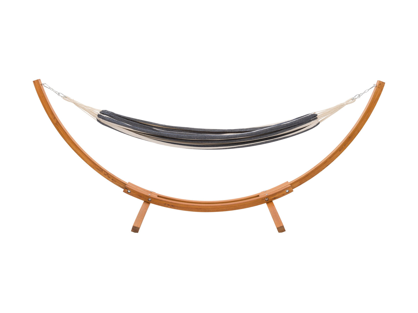 Eye‐catching curved solid wood frame sets this Free Standing Sling Hammock apart from the crowd. The larch wood curved stand provides durability and stability and the densely woven cotton hammock is easy to remove for storage. The free‐standing design means there is no need for any other support, it’s simple, just place it in your favorite backyard spot and relax!Product Specifications