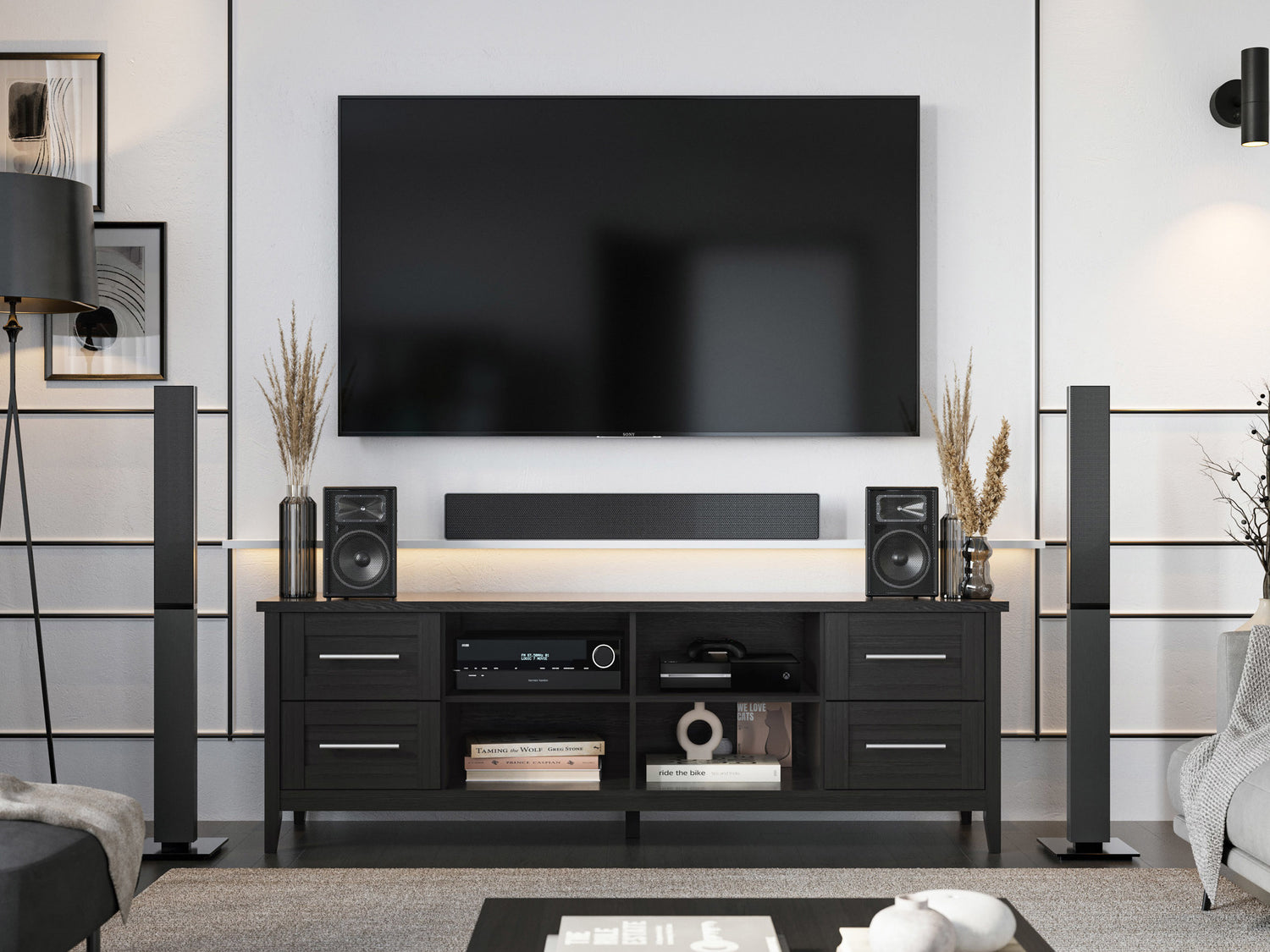- Open Shelves: Provides additional storage and display space for AV components, gaming consoles, and decor items.